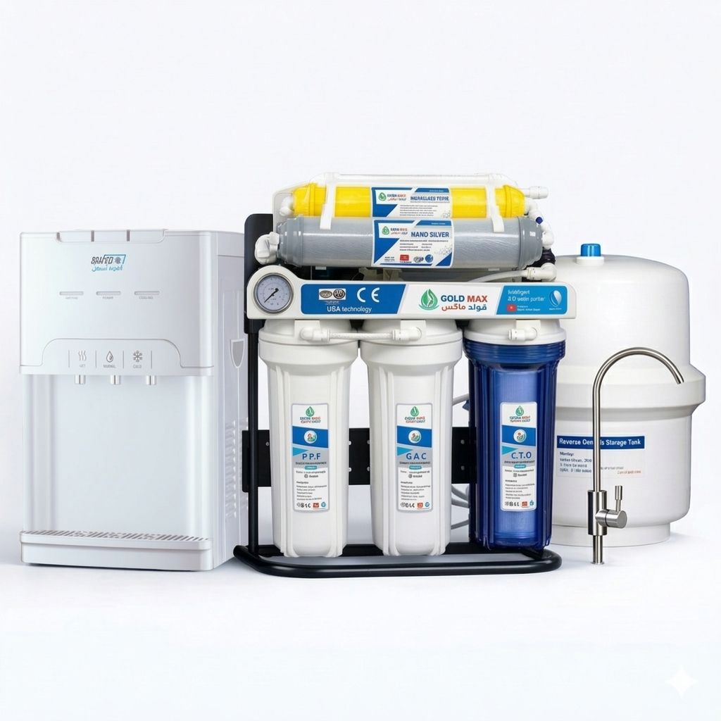 جهاز تحلية مياه 7 مراحل مع برادة ذكية وقاعدة وساعة – نظام منزلي متكامل (متعدد الألوان)